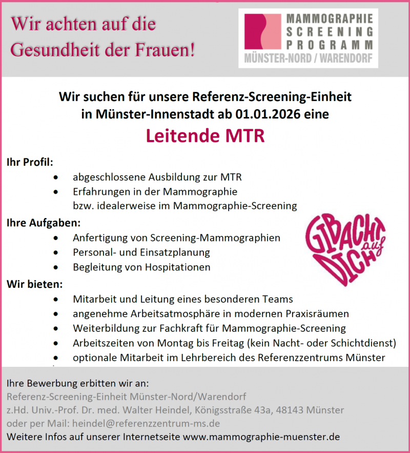 Seit 15 Jahren werden in unserer Referenz-Screening-Einheit Münster-Nord mammographische Untersuchungen - den hohen Qualitätsanforderungen des deutschen Mammographie-Screening-Programms entsprechend - erfolgreich angefertigt.
